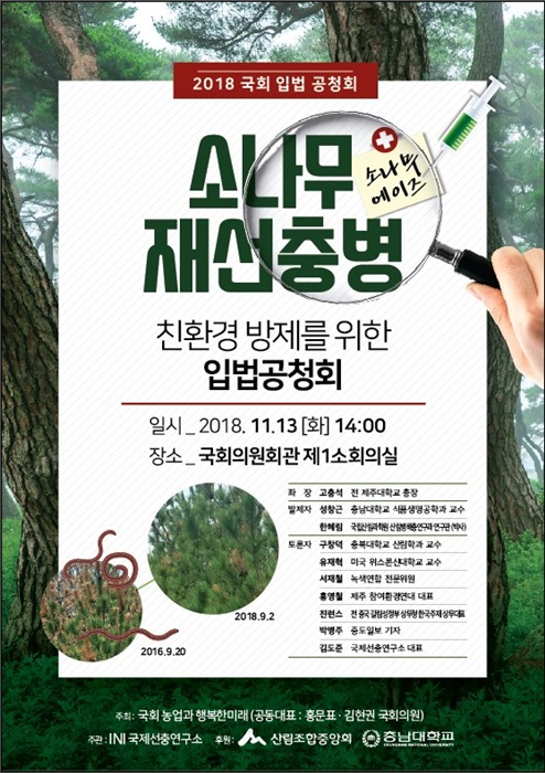 이번 공청회는 ‘국회 농업과 행복한 미래‘의 공동대표인 홍문표 국회의원과 김현권 국회의원이 주최하는 공청회로서 국제선충연구소가 주관하고 산림조합중앙회와 충남대학교가 후원합니다. 주제는 ’소나무재선충병 친환경 방제를 위한 입법공청회‘ 입니다.