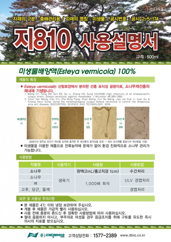 ∎연구를 계속해서가 금년 1월에 농진청에서 충해관리용 미생물 농업자재 (지810)로 허가를 받았음