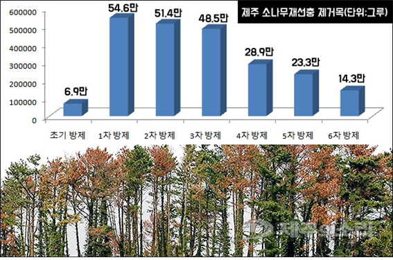2차 방제기간(2014.10~2015.4)에는 51만4000그루, 3차 방제(2015.10~2016.4)는 48만4000그루, 4차 방제(2016.10~2017.4)에는 28만9000그루를 또다시 잘라냈다.